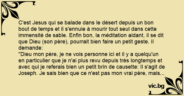 C'est Jesus qui se balade dans le désert depuis un bon bout de temps et il s'ennuie à mourir tout seul dans cette immensité de sable. Enfin bon, la méditation aidant, il se dit que Dieu (son père), pourrait bien faire un petit geste. Il demande: