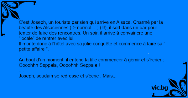 C'est Joseph, un touriste parisien qui arrive en Alsace. Charmé par la beauté des Alsaciennes (-> normal... ;-) !!), il sort dans un bar pour tenter de faire des rencontres. Un soir, il arrive à convaincre une "locale" de rentrer avec lui.