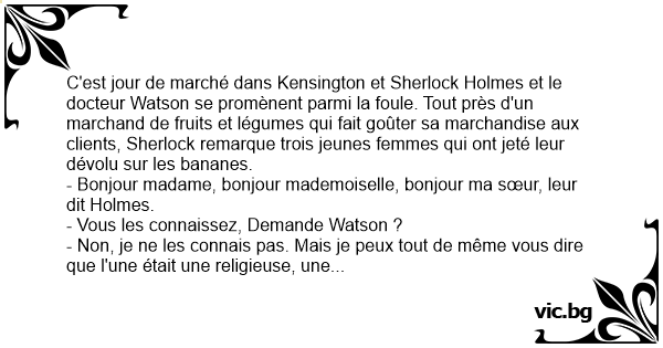 C'est jour de marché dans Kensington et Sherlock Holmes et le docteur Watson se promènent parmi la foule. Tout près d'un marchand de fruits et légumes qui fait goûter sa marchandise aux clients, Sherlock remarque trois jeunes femmes qui ont jeté leur dévolu sur les bananes.