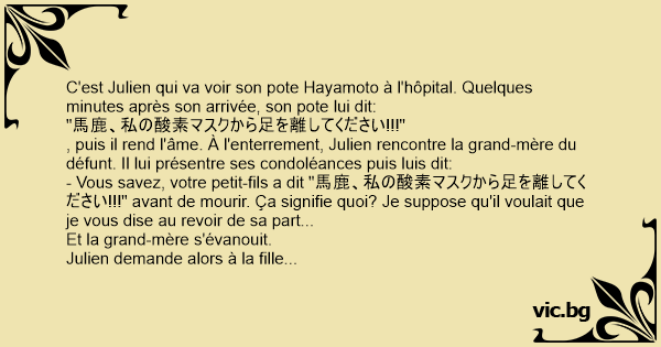 - Vous savez, votre petit-fils a dit "馬鹿、私の酸素マスクから足を離してください!!!" avant de mourir. Ça signifie quoi? Je suppose qu'il voulait que je vous dise au revoir de sa part...
