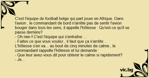 C'est l'équipe de football belge qui part jouer en Afrique. Dans l'avion , le commandant de bord n'arrête pas de sentir l'avion bouger dans tous les sens, il appelle l'hôtesse : Qu'est-ce qu'il se passe derrière?