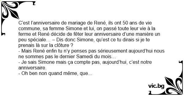C’est l’anniversaire de mariage de René, ils ont 50 ans de vie commune, sa femme Simone et lui, on passé toute leur vie à la ferme et René décide de fêter leur anniversaire d’une manière un peu spéciale… – Dis donc Simone, qu’est ce tu dirais si je te prenais là sur la clôture ?
