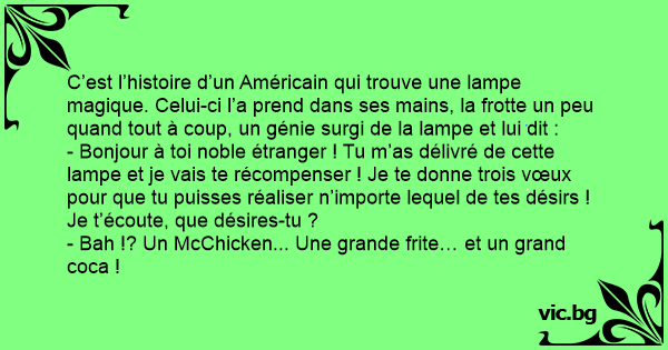 C’est l’histoire d’un Américain qui trouve une lampe magique. Celui-ci l’a prend dans ses mains, la frotte un peu quand tout à coup, un génie surgi de la lampe et lui dit :