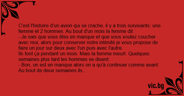 C'est l'histoire d'un avion qui se crache, il y a trois survivants: une femme et 2 hommes. Au bout d'un mois la femme dit :
