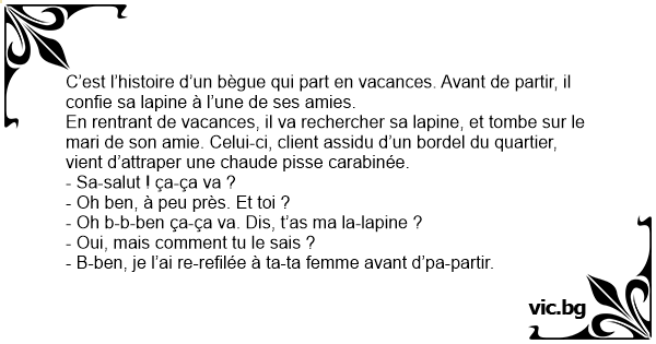 C’est l’histoire d’un bègue qui part en vacances. Avant de partir, il confie sa lapine à l’une de ses amies.