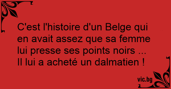 C'est l'histoire d'un Belge qui en avait assez que sa femme lui presse ses points noirs ... Il lui a acheté un dalmatien !