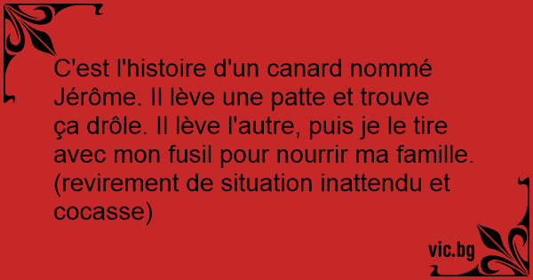 C'est l'histoire d'un canard nommé Jérôme. Il lève une patte et trouve ça drôle. Il lève l'autre, puis je le tire avec mon fusil pour nourrir ma famille. (revirement de situation inattendu et cocasse)