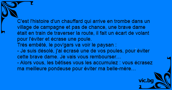 C'est l'histoire d'un chauffard qui arrive en trombe dans un village de campagne et pas de chance, une brave dame était en train de traverser la route, il fait un écart de volant pour l'éviter et écrase une poule.