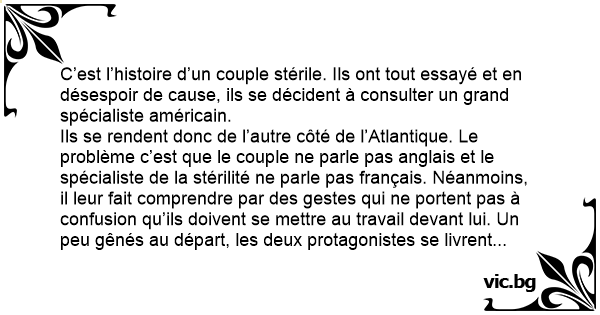 Ils se rendent donc de l’autre côté de l’Atlantique. Le problème c’est que le couple ne parle pas anglais et le spécialiste de la stérilité ne parle pas français. Néanmoins, il leur fait comprendre par des gestes qui ne portent pas à confusion qu’ils doivent se mettre au travail devant lui. Un peu gênés au départ, les deux protagonistes se livrent donc à un ébat sexuel devant le spécialiste mondial des problèmes de fécondité. Il commence alors à inspecter le couple sous toutes les coutures pendant 4 à 5 minutes puis crie STOP ! Et il s’engouffre alors dans son bureau et rédige une ordonnance qu’il remet au couple. Les deux amoureux sont soulagés, certains que le grand professeur a trouvé un remède à leur incapacité folle de procréer. De retour en France, ils s’empressent d’aller à la pharmacie et monsieur demande :