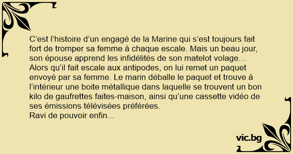 La scène est édifiante : on voit l’épouse du matelot en train de prodiguer des caresses buccales au meilleur ami du mari !!! Le tout dure une quinzaine de secondes ; des secondes qui semblent durer des heures pour le marin, devenu soudain aussi blanc qu’un linge, alors que ses potes s’étranglent de rire…