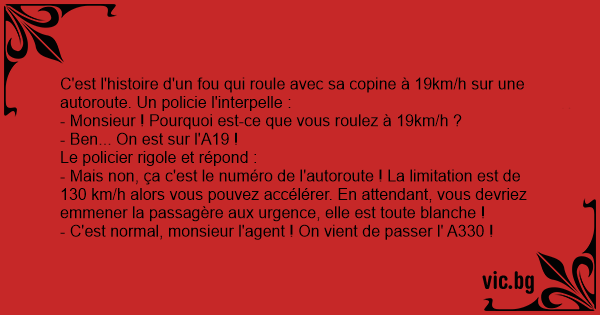 - Mais non, ça c'est le numéro de l'autoroute ! La limitation est de 130 km/h alors vous pouvez accélérer. En attendant, vous devriez emmener la passagère aux urgence, elle est toute blanche !