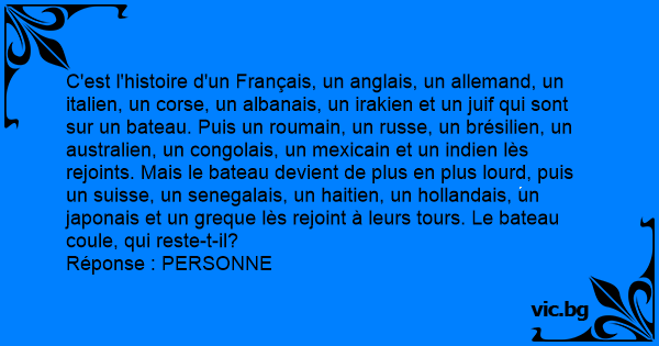 C'est l'histoire d'un Français, un anglais, un allemand, un italien, un corse, un albanais, un irakien et un juif qui sont sur un bateau. Puis un roumain, un russe, un brésilien, un australien, un congolais, un mexicain et un indien lès rejoints. Mais le bateau devient de plus en plus lourd, puis un suisse, un senegalais, un haitien, un hollandais, un japonais et un greque lès rejoint à leurs tours. Le bateau coule, qui reste-t-il?