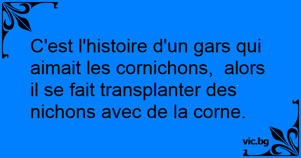 C'est l'histoire d'un gars qui aimait les cornichons, alors il se fait transplanter des nichons avec de la corne.