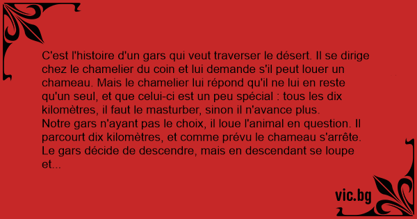 C'est l'histoire d'un gars qui veut traverser le désert. Il se dirige chez le chamelier du coin et lui demande s'il peut louer un chameau. Mais le chamelier lui répond qu'il ne lui en reste qu'un seul, et que celui-ci est un peu spécial : tous les dix kilomètres, il faut le masturber, sinon il n'avance plus.