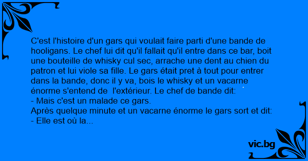 C'est l'histoire d'un gars qui voulait faire parti d'une bande de hooligans. Le chef lui dit qu'il fallait qu'il entre dans ce bar, boit une bouteille de whisky cul sec, arrache une dent au chien du patron et lui viole sa fille. Le gars était pret à tout pour entrer dans la bande, donc il y va, bois le whisky et un vacarne énorme s'entend de l'extérieur. Le chef de bande dit: