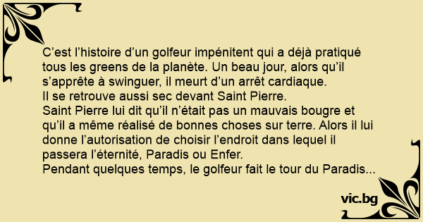 Naturellement, l’accès au terrain est gratuit et illimité pour tous les habitants de l’enfer… Alors le golfeur n’hésite pas une seconde : il fait savoir à Sаinт Pierre qu’il a choisi de passer son éternité en enfer.