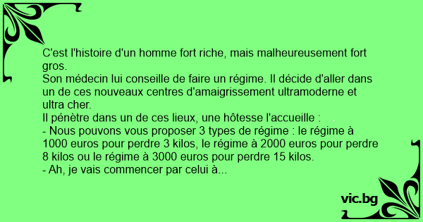 - Nous pouvons vous proposer 3 types de régime : le régime à 1000 euros pour perdre 3 kilos, le régime à 2000 euros pour perdre 8 kilos ou le régime à 3000 euros pour perdre 15 kilos.