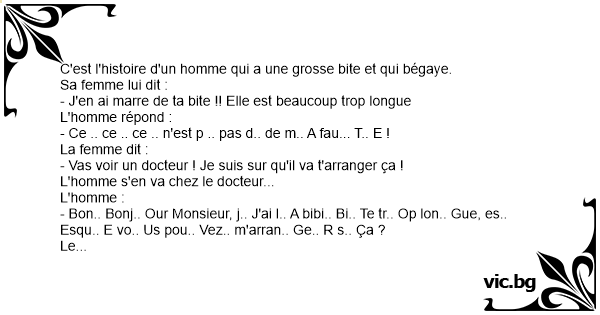 - Chérie t'a vu ma bite ? Elle est plus courte, elle fait 32 centimètres. Et je ne bégaye plus !