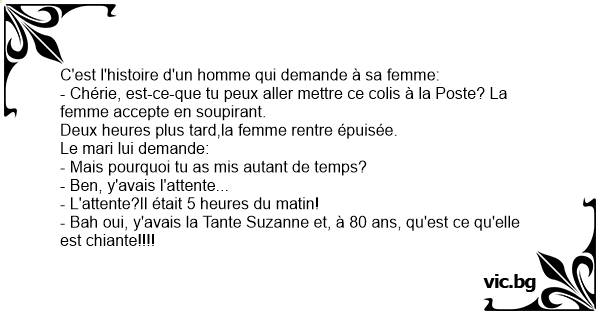- Chérie, est-ce-que tu peux aller mettre ce colis à la Poste? La femme accepte en soupirant.