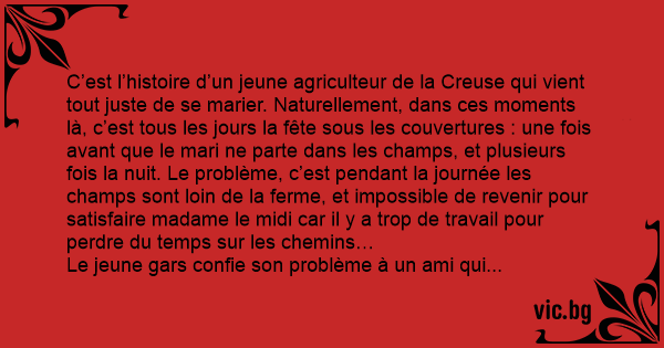 C’est l’histoire d’un jeune agriculteur de la Creuse qui vient tout juste de se marier. Naturellement, dans ces moments là, c’est tous les jours la fête sous les couvertures : une fois avant que le mari ne parte dans les champs, et plusieurs fois la nuit. Le problème, c’est pendant la journée les champs sont lоin de la ferme, et impossible de revenir pour satisfaire madame le midi car il y a trop de travail pour perdre du temps sur les chemins…