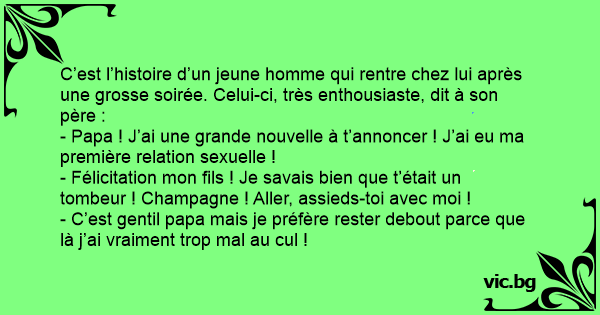 - Papa, j'ai perdu ma virginité ! - Bravo je suis fier de toi fiston ! - Merci papa ! - Assieds-toi on va fêter ça. - Je peux pas m'asseoir.