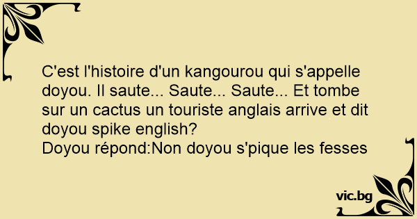 C'est l'histoire d'un kangourou qui s'appelle doyou. Il saute... Saute... Saute... Et tombe sur un cactus un touriste anglais arrive et dit doyou spike english?