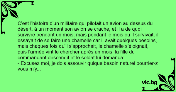 C'est l'histoire d'un militaire qui pilotait un avion au dessus du désert, à un moment son avion se crache, et il a de quoi survivre pendant un mois, mais pendant le mois ou il survivait, il essayait de se faire une chamelle car il avait quelques besoins, mais chaques fois qu'il s'approchait, la chamelle s'éloignait, puis l'armée vint le chercher après un mois, la fille du commandant descendit et le soldat lui demanda: