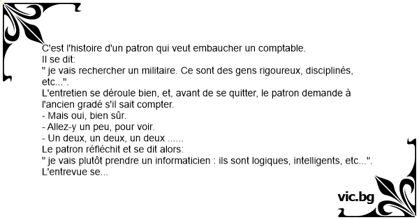 L'entretien se déroule bien, et, avant de se quitter, le patron demande à l'ancien gradé s'il sait compter.