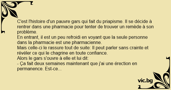 - Ça fait deux semaines maintenant que j'ai une érection en permanence. Est-ce que vous avez quelque chose pour moi?