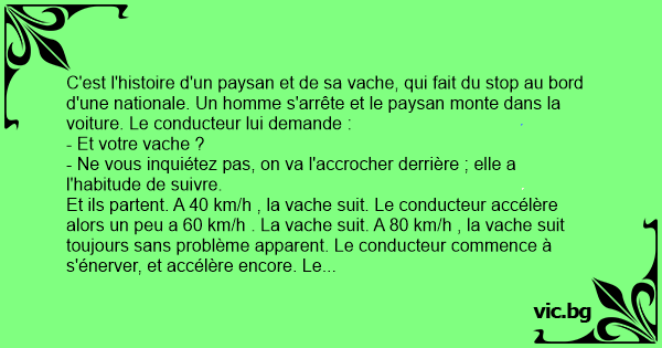 Et ils partent. A 40 km/h , la vache suit. Le conducteur accélère alors un peu a 60 km/h . La vache suit. A 80 km/h , la vache suit toujours sans problème apparent. Le conducteur commence à s'énerver, et accélère encore. Le petit jeu se poursuit jusqu'aux limites de sa voiture.
