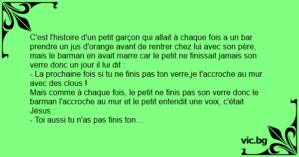 C'est l'histoire d'un petit garçon qui allait à chaque fois a un bar prendre un jus d'orange avant de rentrer chez lui avec son père, mais le barman en avait marre car le petit ne finissait jamais son verre donc un jour il lui dit :