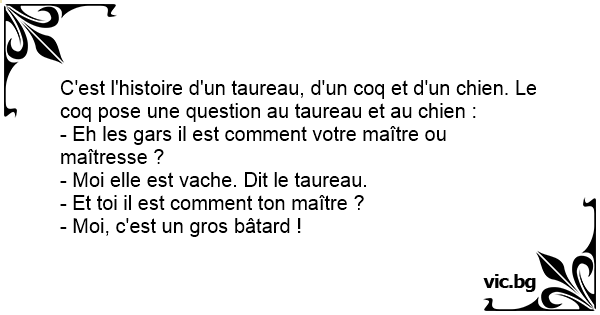 C'est l'histoire d'un taureau, d'un coq et d'un chien. Le coq pose une question au taureau et au chien :