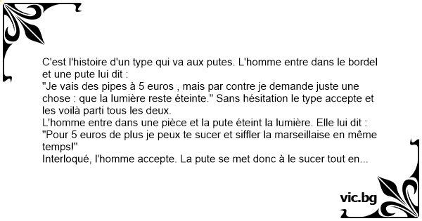 "Je vais des pipes à 5 euros , mais par contre je demande juste une chose : que la lumière reste éteinte." Sans hésitation le type accepte et les voilà parti tous les deux.