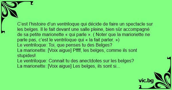 C’est l’histoire d’un ventriloque qui décide de faire un spectacle sur les belges. Il le fait devant une salle pleine, bien sûr accompagné de sa petite marionette « qui parle ». ( Noter que la marionette ne parle pas, c’est le ventriloque qui « la fait parler. »)