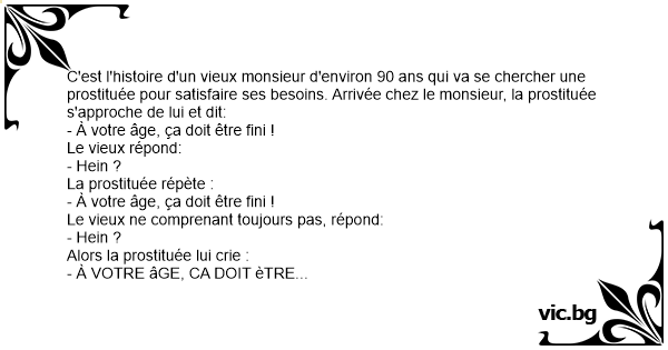 C'est l'histoire d'un vieux monsieur d'environ 90 ans qui va se chercher une prostituée pour satisfaire ses besoins. Arrivée chez le monsieur, la prostituée s'approche de lui et dit: