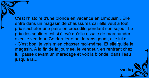 - C'est bon, je vais m'en chasser moi-même. Et elle quitte le magasin. A la fin de la journée, le vendeur, en rentrant chez lui, passe devant un marécage et voit la blonde, dans l'eau jusqu'à la taille, armée d'un fusil. Sur le bord du marécage, cinq ou six crocodiles sont morts, alignés sur la terre ferme. A ce moment, il voit dans l'eau un énorme crocodile de 10 ou 12 mètres s'approcher de la blonde. Ваng ! La blonde l'abat, le traîne sur la terre ferme, le retourne sur le dos et dit: