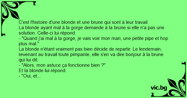 La blonde n'étant vraiment pas bien décide de repartir. Le lendemain, revenant au travail toute pimpante, elle s'en va dire bonjour à la brune qui lui dit: