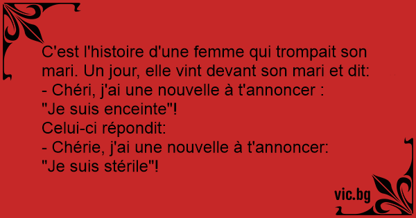 C'est l'histoire d'une femme qui trompait son mari. Un jour, elle vint devant son mari et dit: