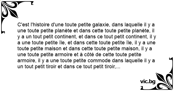 C'est l'histoire d'une toute petite galaxie, dans laquelle il y a une toute petite planète et dans cette toute petite planète, il y a un tout petit continent, et dans ce tout petit continent, il y a une toute petite île, et dans cette toute petite île, il y a une toute petite maison et dans cette toute petite maison, il y a une toute petite armoire et à côté de cette toute petite armoire, il y a une toute petite commode dans laquelle il y a un tout petit tiroir et dans ce tout petit tiroir, il y a un tout petit coffre et dans ce tout petit coffre, il y a un tout petit carnet et dans ce tout petit carnet, il y a un tout petit mot et dans ce tout petit mot, il est écrit : ça fait 5 minutes que je vous embête !!!!