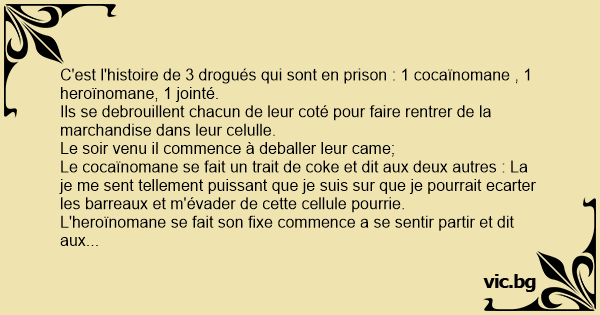 C'est l'histoire de 3 drogués qui sont en prison : 1 cocaïnomane , 1 heroïnomane, 1 jointé.