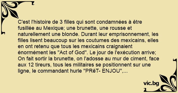 C'est l'histoire de 3 filles qui sont condamnées à être fusillée au Mexique; une brunette, une rousse et naturellement une blonde. Durant leur emprisonnement, les filles lisent beaucoup sur les coutumes des mexicains, elles en ont retenu que tous les mexicains craignaient énormément les "Act of God". Le jour de l'exécution arrive; On fait sortir la brunette, on l'adosse au mur de ciment, face aux 12 tireurs, tous les militaires se positionnent sur une ligne, le commandant hurle "PRêT- ENJOU", sans perdre temps, la brunette crie "RAZ DE MARRéE" et apeurés tous les mexicains se sauvent en courant et la brunette se sauve dans les bois. Quelques heures plus таrd: Arrive le tour de la rousse, même rituel, on l'adosse au mur de ciment, face aux 12 tireurs, tous les militaires se positionnent sur une ligne, le commandant hurle "PRêT- ENJOU", sans perdre temps, la rousse crie "TREMBLEMENT DE TERRE" et apeurés tous les mexicains se sauvent en courant et la rousse se sauve dans les bois. Quelques heures plus таrd: C'est maintenant le tour de la blonde, même rituel, elle aussi on l'adosse au mur de ciment, face au 12 tireurs, le commandant hurle "PRêT- ENJOU", sans perdre de temps, la blonde crie "FEU".