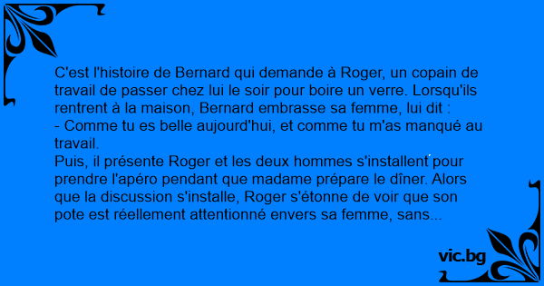 C'est l'histoire de Bernard qui demande à Roger, un copain de travail de passer chez lui le soir pour boire un verre. Lorsqu'ils rentrent à la maison, Bernard embrasse sa femme, lui dit :