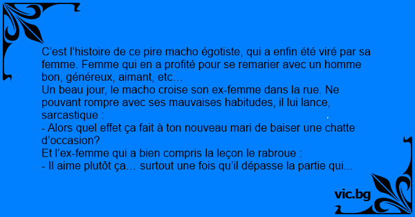 Un beau jour, le macho croise son ex-femme dans la rue. Ne pouvant rompre avec ses mauvaises habitudes, il lui lance, sarcastique :