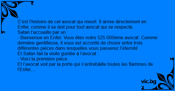 - Bienvenue en Enfer. Vous êtes notre 525 000ème avocat. Comme dernière gentillesse, il vous est accordé de choisir entre trois différentes pièces dans lesquelles vous passerez l’éternité.