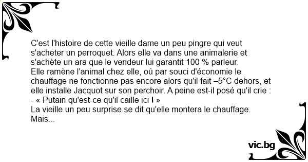 Et ça dure comme ça plusieurs jours, et tout ça bien que la maison soit maintenant correctement chauffée. Alors finalement la vieille retourne à l'animalerie et demande au vendeur ce qu'elle doit faire pour calmer son perroquet. Le vendeur lui conseille le stress. Il lui dit :