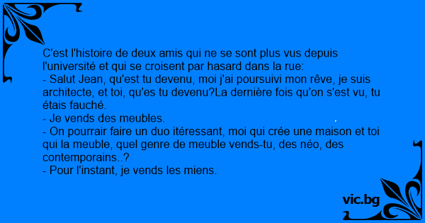- Salut Jean, qu'est tu devenu, moi j'ai poursuivi mon rêve, je suis architecte, et toi, qu'es tu devenu?La dernière fois qu'on s'est vu, tu étais fauché.