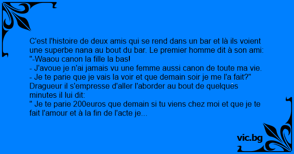 C'est l'histoire de deux amis qui se rend dans un bar et là ils voient une superbe nana au bout du bar. Le premier homme dit à son ami: