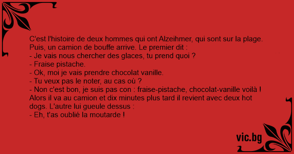 C'est l'histoire de deux hommes qui ont Alzeihmer, qui sont sur la plage. Puis, un camion de bouffe arrive. Le premier dit :