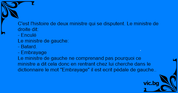 Le ministre de gauche ne comprenand pas pourquoi ce ministre a dit cela donc en rentrant chez lui cherche dans le dictionnaire le mot "Embrayage" il est ecrit pédale de gauche..