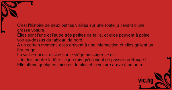 Au croisement suivant, là encore, le feu est rouge cramoisi mais la voiture passe comme s'il était vert. Alors la vieille se tourne vers sa copine à gauche et lui hurle :